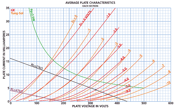 40年以上前の当時ここまで詳しく解らなかった。 ![]() 843の動作曲線。最大プレート損失の85%で動作設定。以前は小出力管なのに62%でかなり小出力だった。 ![]() ECC81 / 12AT7の動作曲線。初段は紫、KF段は黒のロードライン。メーカーによってだいぶ曲線が違うので結構困るが、以前GEの曲線(赤線)で製作して電圧がピッタリ合ったので、今回もそちらで設計。橙はタングソル。 こーゆー使い方すると後でPPアンプに流用できなくなるんだよな〜と思いつつ・・・ |