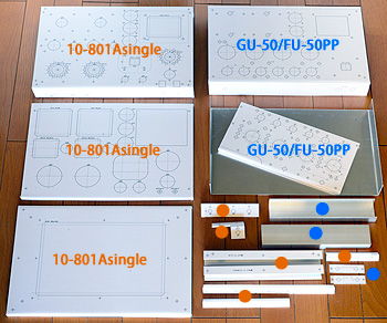 デザインシャーシーの基本構造はEL34 / 6CA7プッシュプルと同じ作り方で本機で4台目になります。シャーシーも自作する都合上、強度的なことを考えると幅400mmを超える場合、このサンドイッチ形状の構造が一番安心できます。もちろんトップパネルの上部引き抜き機能も継承しています。 欠点としては補強材の多さや穴あけ工数の多さなど、手間もコストも掛かりますが、自由にサイズが決められて強度もあるので変えられません。 色は2つの要因から決めています。十数年前に色々な組み合わせができるようスプレー塗料をまとめて数十本買ったのですが、そろそろ使わないと保管期間を考えるとダメになりそうなので、ここ数年に作ったアンプ数台はそれが理由で色を決めています。 本機は塗料の保存期間が長いものを先に使う目的と、トランスのエンブレムに色を合わせて決めました。 従ってNC-14はGU-50 / FU-50プッシュプルでも使い、残り少なくなったコバルトブルー、5BC10はゴールドアンバー、それに合わせてシャーシーも同色です。普通にメタリックゴールドの方が合いそうですが、持っていないので。 OPTとPTはTANGOのエンブレムが黒なのと保管状態が良かったためまだ新品のような見た目でしたので、今回は黒いまま使いました。 これらの色の組み合わせは悪くはないんですが、古典管なのでレトロな感じにしようと思ってたのに、またいつものクセで現代風なデザインになってしまいました。在庫塗料を使い切るまでムリかも知れません。 VT-62 / 801A使用時のパワー切換えスイッチはいつものように気安く操作できないよう、ショートレバーのトグルスイッチをチョークと電源トランスの隙間に配置しています。 定電圧放電管2本はチョークの前に配置しました。本機のように電圧ドロップとして使用した場合のリスクを考えてのことです。 まだ真空管全盛時代に無線機器ではこのような使い方をしているものを何度か見たことがありますが、オーディオアンプでの使用はあまり例がありません。 そこでもし失敗した時はマジックアイに変えてレベルメーターにでもするか、と保険を掛けたレイアウトにしました。 ![]() ↑ チョークの前に配置した0B2WAが怪しく光る。失敗してここがマジックアイに変わらないことを祈る。 |