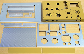 ![]() ↑ 3台同時製作中のうちの2台分。初期のシャーシー構成なので、この後色々追加パーツが増えた。●印はサブパネルと内部補強用のアルミチャンネル。 ![]() ↑ アルミ板折り曲げ中にバイスが折れたため、精度が1mmも狂ってしまった。 |