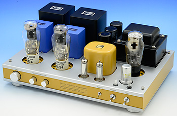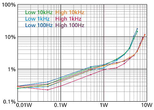入出力特性です。以後全てパワー管はユナイテッドの801A、整流管はレイセオンの0Z4G、右チャンネルの測定データです。 +BスイッチのLowとHighで途中まではほぼ変わりません。クリッピングポイントはLowが4.2W、Highが7.5Wあたりですがオシロで正弦波の山がつぶれ始めるのがLow=5W、High=7.6Wでした。 但し歪率5%を基準に考えるとLow=4.2W、High=7W弱でしたので、総合的に判断すると定格出力はLow=4.2W、High=7.5Wあたりで良いかと思います。その時の入力感度はLow=0.5V、High=0.65Vあたりで私が作るアンプにしては高感度です。 A2級でグリッドのプラス領域も使えますから、入力を増やせばさらに出力は伸び、Lowで7W、Highでは10W以上も出ていますが歪みは10%を超え、波形も破綻しています。まあ、過大入力に対する追従性があるマージンと見た方が良いでしょう。 |