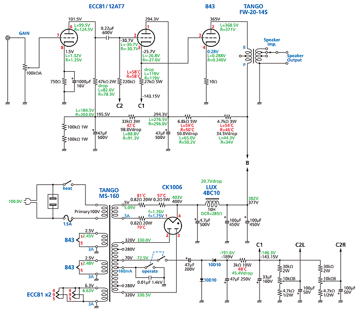 ![]() 黒字・青字=設計値、緑字・赤字=実測値 843、12AT7とも新品ではない使用品のためエミッションの偏りにより実測電圧もバラついている。 | |||||||||||||||||||||||||||||||||||||||||||||||