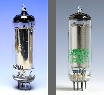 使用球10系送信管を色々挿し替えるんですが、調整・測定用にVT-62 / 801Aをデフォルトとして使用します。これは+B電圧をHigh側でも同じ球で違いを見るためです。メーカーはVT-62と言えばハイトロン・・・と思っていたのですが、自分の勘違いで昔ハイトロンを買ったつもりでRCAとユナイテッドしかありませんでした。あれ? 以前のアンプは早々に解体してしまったので両方とも消耗のないNOSに近い球です。どちらでも良いのですが、今回は球のベースと文字の色がシャーシーの色と良く合うのでユナイテッドをデフォルトに決めました。 5687WAと5R4GYはRCAやGE、シルバニアなど合衆国製も色々在庫していましたが、印字の向きや日本球が好きだと言う理由で東芝をデフォルトで使います。こちらもほぼ未使用で測定にピッタリと判断したためです。 0Z4Gは少々選定に苦労しました。この球、ラッシュカレントが大きくガス入り冷陰極管のため初期放電が少し不安定で、CK1006の時に感じていた不安がそのまま当たってしまいました。 まあシャーシー加工してしまい今さら変更できないので、3本しかない0Z4Gを選別(できてないが)して一番程度の良さそうなレイセオンのものをデフォルトにしました。 在庫の3本がどうしてもダメそうな時は同じレイセオンのCK1007を使うことにします。 0B2 / VR105MTは前述のように在庫全て放電電圧を試験し、108Vに近かったシルバニアの0B2WAを使います。 テストしてみると104V〜115V位までバラついていて、本機ではそのまま5687への供給電圧が変わってしまいます。まあ、それでも余裕のあるプレート損失で設計していますので、108Vから少しかけ離れても問題ないと言えばないんですが。 |