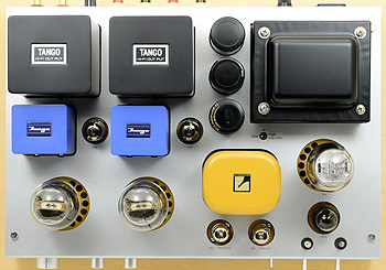 デザインシャーシーの基本構造はEL34 / 6CA7プッシュプルと同じ作り方で本機で4台目になります。シャーシーも自作する都合上、強度的なことを考えると幅400mmを超える場合、このサンドイッチ形状の構造が一番安心できます。もちろんトップパネルの上部引き抜き機能も継承しています。 欠点としては補強材の多さや穴あけ工数の多さなど、手間もコストも掛かりますが、自由にサイズが決められて強度もあるので変えられません。 色は2つの要因から決めています。十数年前に色々な組み合わせができるようスプレー塗料をまとめて数十本買ったのですが、そろそろ使わないと保管期間を考えるとダメになりそうなので、ここ数年に作ったアンプ数台はそれが理由で色を決めています。 本機は塗料の保存期間が長いものを先に使う目的と、トランスのエンブレムに色を合わせて決めました。 従ってNC-14はGU-50 / FU-50プッシュプルでも使い、残り少なくなったコバルトブルー、5BC10はゴールドアンバー、それに合わせてシャーシーも同色です。普通にメタリックゴールドの方が合いそうですが、持っていないので。 OPTとPTはTANGOのエンブレムが黒なのと保管状態が良かったためまだ新品のような見た目でしたので、今回は黒いまま使いました。 これらの色の組み合わせは悪くはないんですが、古典管なのでレトロな感じにしようと思ってたのに、またいつものクセで現代風なデザインになってしまいました。在庫塗料を使い切るまでムリかも知れません。 VT-62 / 801A使用時のパワー切換えスイッチはいつものように気安く操作できないよう、ショートレバーのトグルスイッチをチョークと電源トランスの隙間に配置しています。 定電圧放電管2本はチョークの前に配置しました。本機のように電圧ドロップとして使用した場合のリスクを考えてのことです。 まだ真空管全盛時代に無線機器ではこのような使い方をしているものを何度か見たことがありますが、オーディオアンプでの使用はあまり例がありません。 そこでもし失敗した時はマジックアイに変えてレベルメーターにでもするか、と保険を掛けたレイアウトにしました。 ![]() ↑ チョークの前に配置した0B2WAが怪しく光る。失敗してここがマジックアイに変わらないことを祈る。 |