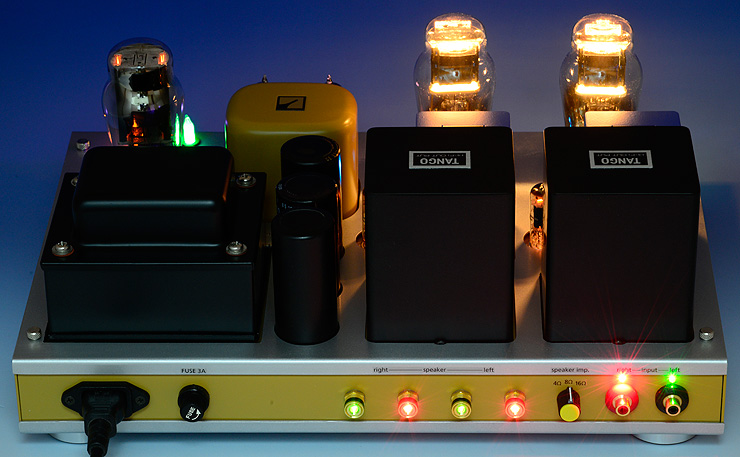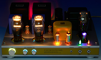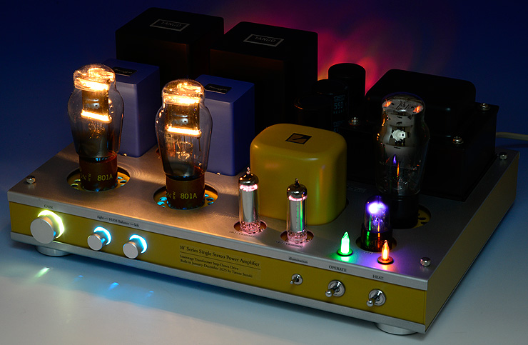 ![]() ↑ イルミネーションオンにした時。前から見てもリアのガイドイルミネーションLEDが相当明るいのが解る。パイロットランプ代わりのネオン球もいつものクセで付けてしまったが色が多すぎか。 ![]() ↑ この通り電流をかなり絞ったがガイドイルミネーションのLEDが相当明るい。スピーカーターミナルの光はバナナプラグのケーブルを挿せば見えなくなるが、RCA入力のLEDだけは使用中にそのまま残る。 |