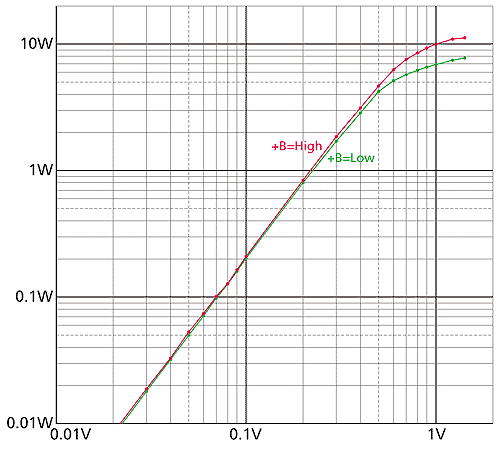 入出力特性です。以後全てパワー管はユナイテッドの801A、整流管はレイセオンの0Z4G、右チャンネルの測定データです。 +BスイッチのLowとHighで途中まではほぼ変わりません。クリッピングポイントはLowが4.2W、Highが7.5Wあたりですがオシロで正弦波の山がつぶれ始めるのがLow=5W、High=7.6Wでした。 但し歪率5%を基準に考えるとLow=4.2W、High=7W弱でしたので、総合的に判断すると定格出力はLow=4.2W、High=7.5Wあたりで良いかと思います。その時の入力感度はLow=0.5V、High=0.65Vあたりで私が作るアンプにしては高感度です。 A2級でグリッドのプラス領域も使えますから、入力を増やせばさらに出力は伸び、Lowで7W、Highでは10W以上も出ていますが歪みは10%を超え、波形も破綻しています。まあ、過大入力に対する追従性があるマージンと見た方が良いでしょう。 |