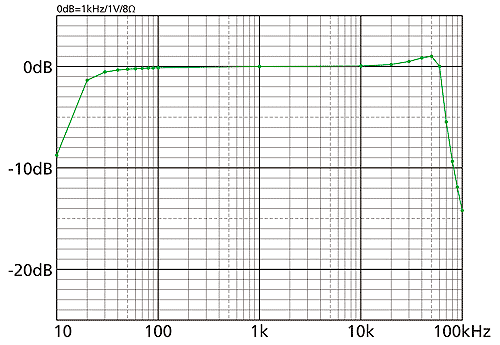 周波数特性です。High・Lowともピッタリグラフが一致したので、片方を消して見やすくしています。これが一番意外でした。無帰還、トランスドライブとしては結構なワイドレンジです。 数値を見なくても音で解るような特性でした。10Hz以下と100kHz以上のグラフはありませんが、無帰還なのでピーク等ないと思い、アナライザーだけの測定結果を示しています。 グラフにしませんでしたが、一応ファンクションジェネレーター+電子電圧計の別測定でピークがないことは確認しています。 おそらくステップダウンで使ったトランスドライブの効果が出ています。初段も5687の低インピーダンス出力が効いていて、全体的に狙った回路構成の成果が出た感じです。 50kHzで少し盛り上がっていますが、これはNC-14出力側を開放で使ったためです。 |